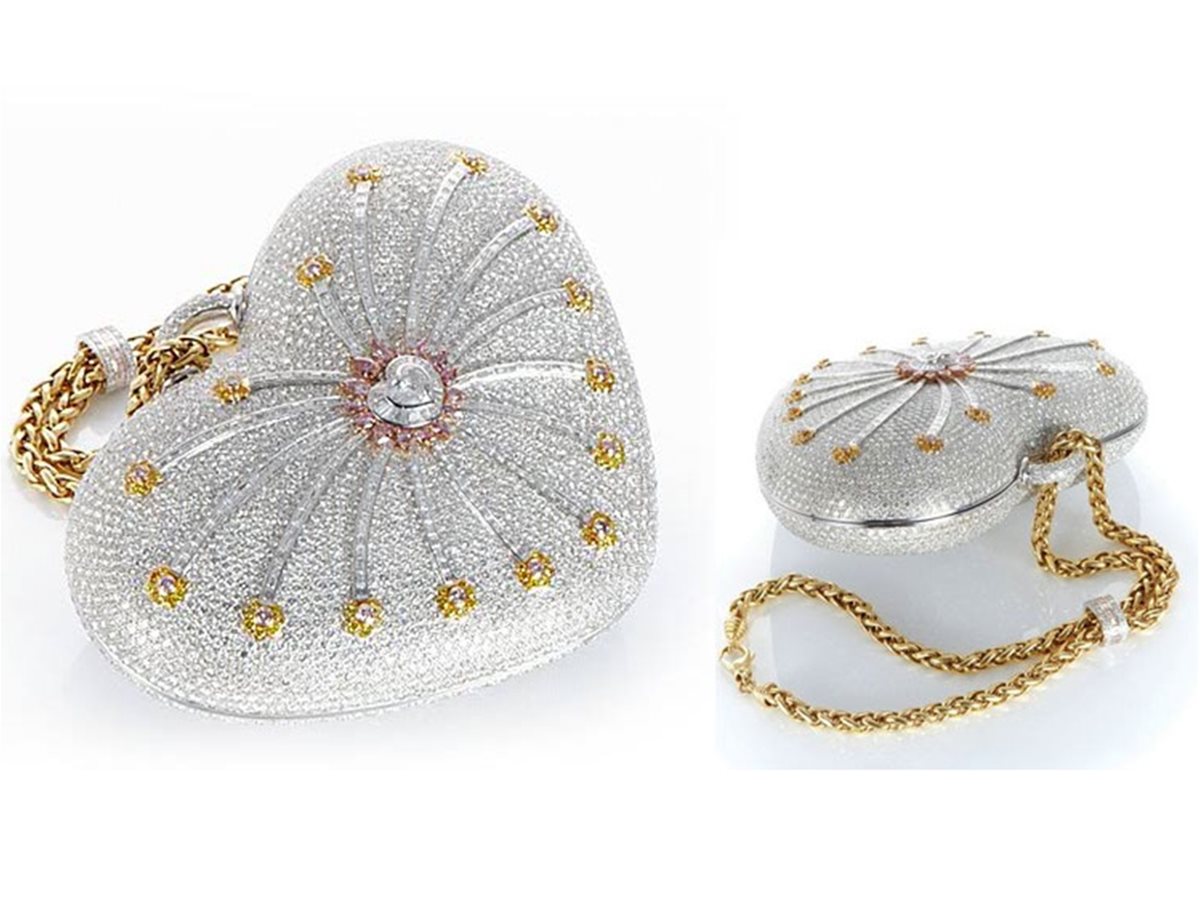 Tas yang memiliki bentuk seperti hati ini merupakan tas termahal nomor satu di dunia loh teman. Tentu dibalik harganya yang sangat memuakau pastinya pembuatanyaa tidak mudah dan menggunakan bahan yang sangat mahal. Bahkan dalam pembuatan tas ini diperlukan 10 orag seniman ternama dengan waktu produksi selama 8800 jam. Tas mewah yang sangat fanastis ini dibuat dengan berlapis emas sebanyak 18 karat dan 4365 permata. Tas mewah ini dibandrol dengan harga Rp. 50 Milliar rupiah.