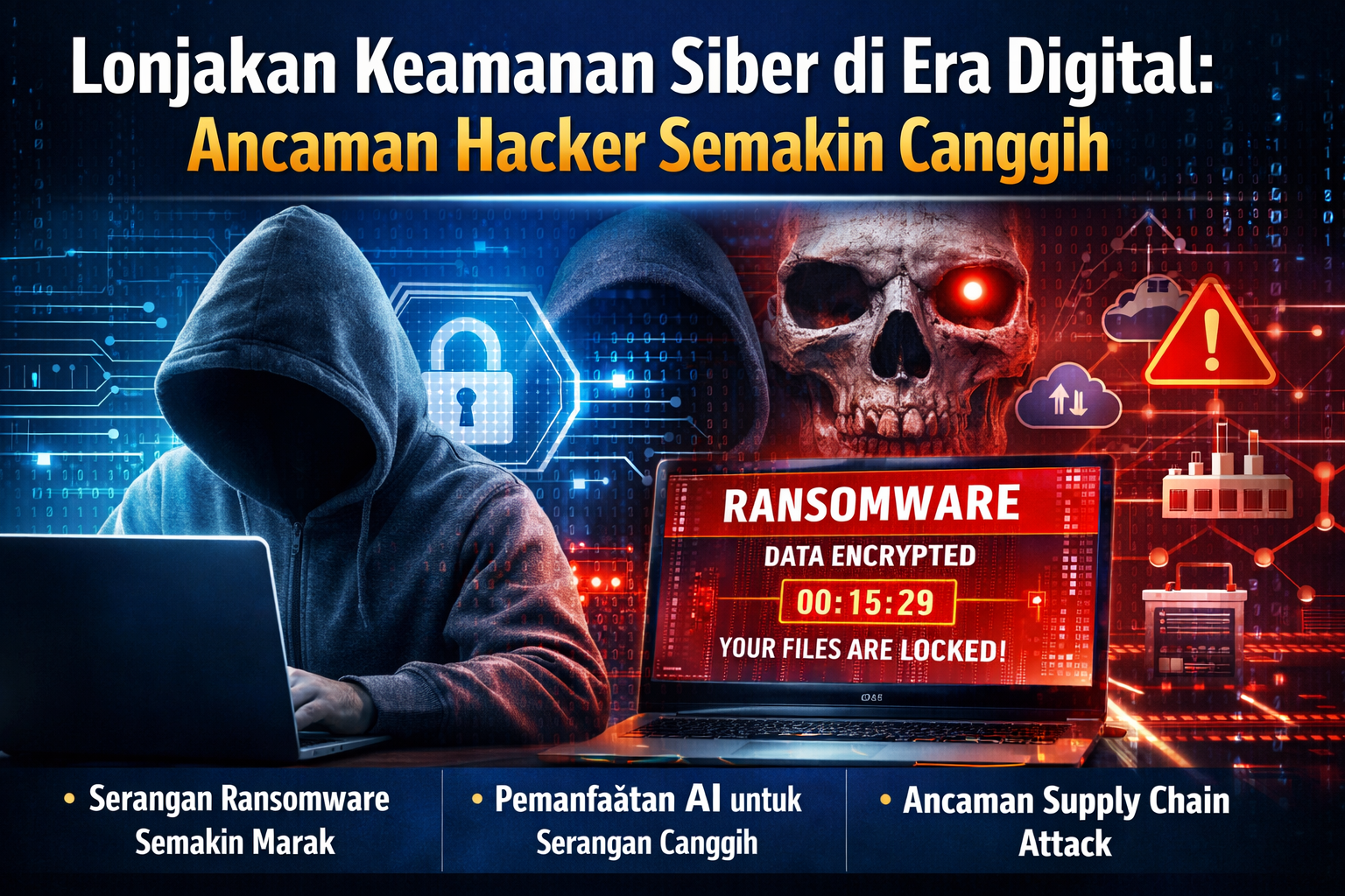 Hacker modern tidak hanya mengandalkan teknik tradisional seperti phishing atau malware. Kini, mereka memanfaatkan kecerdasan buatan (AI) untuk melakukan serangan yang lebih cepat, presisi, dan sulit dideteksi. Serangan ransomware, misalnya, telah berkembang menjadi ancaman global yang dapat melumpuhkan sistem kritis dalam hitungan menit.